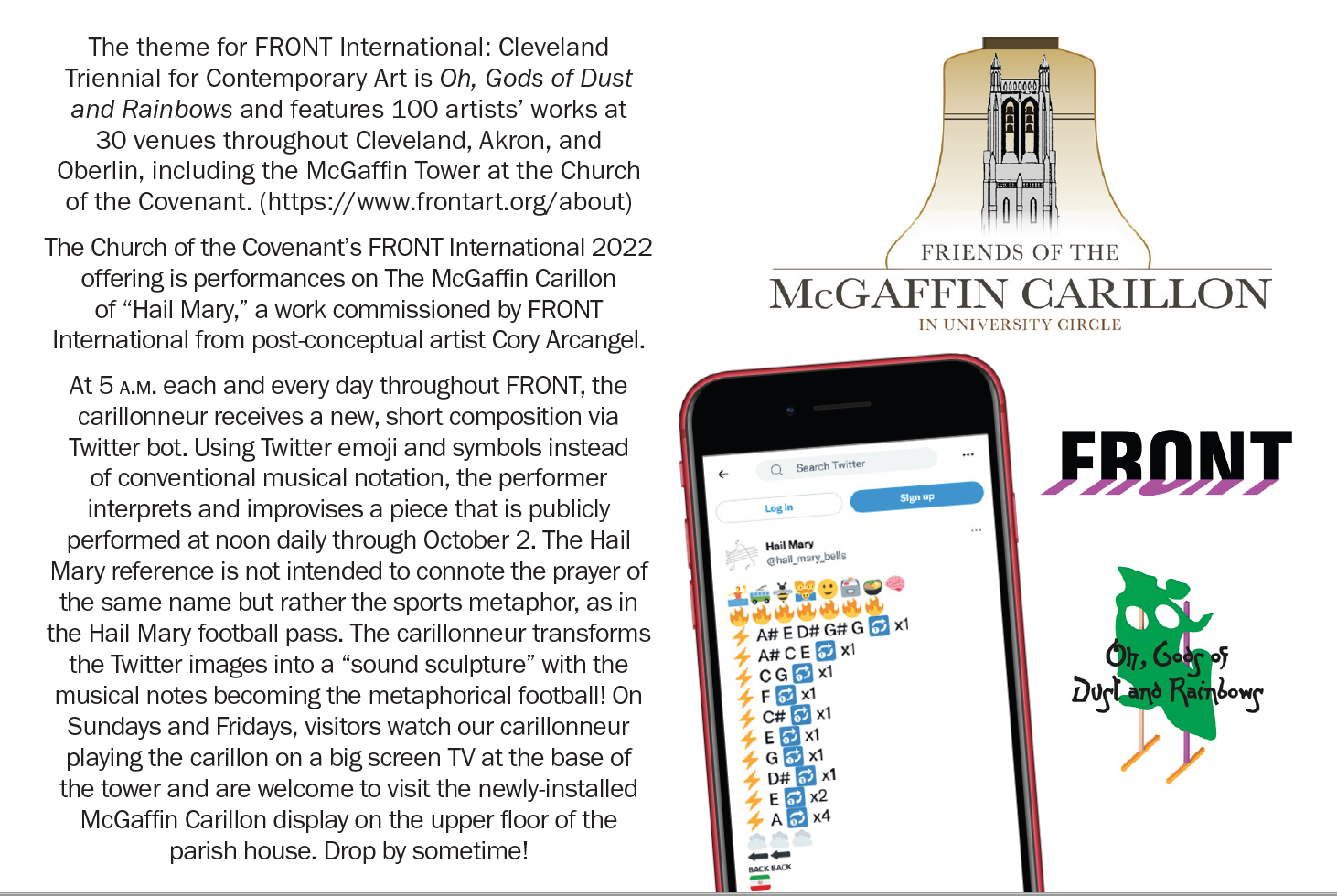 You are invited to a celebration of the completion of the Alexander McGaffin Carillon lighting project. At 9pm on Wednesday 10 August the Church of the Covenant will switch on the lights for the first time while we peal the bells. A half-hour carillon concert by George Leggiero and Keiran Cantilina will begin with a performance of Hail Mary by Cory Arcangel, the quirky piece commissioned by FRONT International. Each day the performer improvises on a new iteration distributed via Twitter bot. There will be refreshments. We hope to see you there!