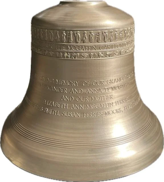However, it was not until 1968 that his dream of installing tower bells was realized—thanks to a bequest from Mrs. McGaffin and gifts from friends. The McGaffin Carillon was cast and installed.
