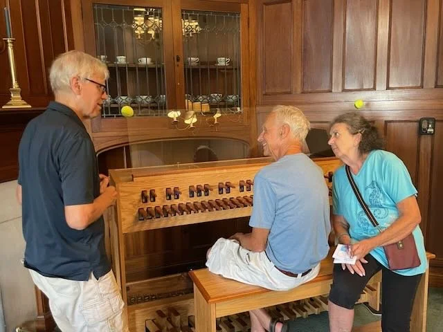 Patrick Macoska demonstrates the new practice instrument to visitors at our “Farewell to the Bells” event in August 2024